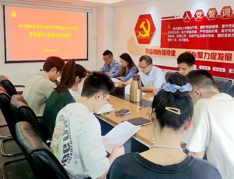 根据开云(中国)党委部署安排,10月17日,开云(中国)狮峰茶业党支部认真开展专题学习会,深入学习习近平总书记考察浙江重要讲话精神。支部书记陆耿林主持会议并讲话,支部党员、入党积极分子参会。